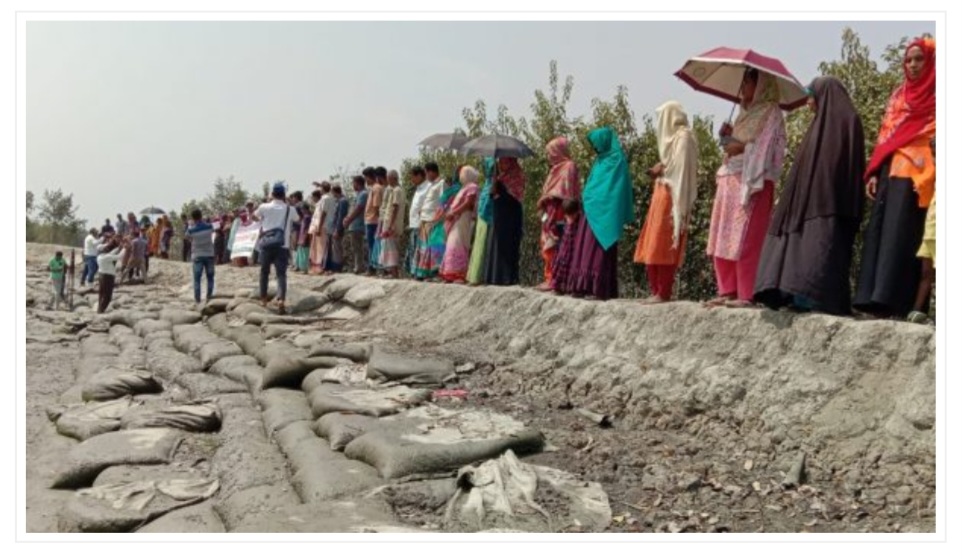বুধবার (৫ মার্চ ) বেলা ১১ টায় শ্যামনগরের বুড়িগোয়ালিনী ইউনিয়ন পরিষদ ও ইউনিয়ন বাসীর আয়োজনে এ মানববন্ধনে একাত্মতা প্রকাশ করেন অত্র উপজেলার সকল উন্নয়ন সংগঠন। উল্লেখ্য, বাংলাদেশের দক্ষিন—পশ্চিমাঞ্চলের সাতক্ষীরার উপকুলীয় শ্যামনগরের সুন্দরবন লাগোয়া ৯নং বুড়িগোয়ালিনী ইউনিয়নটি একটি প্রসিদ্ধ জনপদ। এই ইউনিয়নের অধিকাংশ এলাকা নদী দ্বারা বেষ্টিত হওয়াতে বেড়ীবাঁধগুলো খুবই ঝুঁকিপূর্ন অবস্থানে রয়েছে। জেলে বাওয়ালী, মৌয়ালী, চুনুরী, দুনুরী, বাগদী, মুন্ডা, ঋষী, কাহার সহ নানা শ্রেণী পেশার প্রায় ৩৫ হাজার মানুষের বসবাস এখানে। জলবায়ু পরিবর্তন জনিত বাংলাদেশের নানাবিধ প্রাকৃতিক দুযোর্গের মধ্যে উপকুলীয় এই ইউনিয়নের নদীভাঙন একটি অত্যন্ত গুরুত্বপুর্ন প্রধান সমস্যা। নদী ভাঙন এর ফলে নদীর চর ও ভেড়ীবাঁধ পানির প্রবল চাপে ভেঙে যায়। এই নদীর বাঁধভাঙন এর মধ্য দিয়ে আমরা বুড়িগোয়ালিনী ইউনিয়নবাসী একটি উচ্চ সম্ভাবনাময় উন্নয়নের পথে ধাবিত হচ্চি। এখানের বাগদা ও কাঁকড়া শিল্প পৃথিবী জুড়ে বিখ্যাত।বুড়িগোয়ালিনী ইউনিয়ন পরিষদের চেয়ারম্যান হাজী নজরুল ইসলাম এর সভাপতিত্বে বক্তব্য রাখেন ১নং ওয়ার্ড ইউপি সদস্য গাজী আবিদ হাসান, ৪নং ওয়ার্ড ইউপি সদস্য মো. আব্দুর রউফ, ৫নং ওয়ার্ড ইউপি সদস্য মুকুন্দ পাইক, ৬নং ওয়ার্ড ইউপি সদস্য বিকাশ মুন্ডল, স্থানীয় জনগোষ্ঠীর শেফালি রাণী, সিডিও’র মো. হাফিজ, যুব স্বেচ্ছাসেবী সমন্বয় কমিটির মো. শামীম হোসেন, সুন্দরবন স্টুডেন্ট সলিডারিটি টিমের যুগ্ম-সাধারণ সম্পাদক মো. মোস্তাফিজুর রহমান, পরিবেশকর্মী মো. ফজলুল হক ও স.ম ওসমান গনী সোহাগ প্রমুখ।হাজী নজরুল ইসলাম তার বক্তব্যে বলেন, আমরা বুড়িগোয়ালিনী ইউনিয়ন বাসী নানা প্রতিকুলতার মধ্য দিয়েও সকলের সম্মিলিত প্রয়াসে একটি মডেল ইউনিয়ন গড়ে তোলার নিরন্তর প্রচেষ্টা আব্যহত রেখেছি। আমরা অত্যন্ত দুঃখের সাথে জানাচ্ছি যে, জাপান বাংলাদেশ এর জাইকা প্রকল্পের মাধ্যমে শ্যামনগর পানি উন্নয়ন বোর্ড অত্র ইউনিয়নের দাতিনাখালী সাংবাদিক আনিছুজ্জামান এর বাড়ী সংলগ্ন, পূর্ব দূর্গাবাটি ছবুর খায়ের বাড়ী হতে চেয়ারম্যানের ঘের পর্যন্ত এবং পূর্ব দূর্গাবাটি সাইক্লোন সেল্টারের উভয় পাশের ওয়াপদা রাস্তা সংস্কারের কাজ চালিয়ে যাচ্ছে। কিন্ত এই প্রকল্পের বা কাজের কোন নিয়ম নীতি ইউনিয়ন পরিষদ সহ স্থানীয় মানুষেরা কিছুই জানে না।