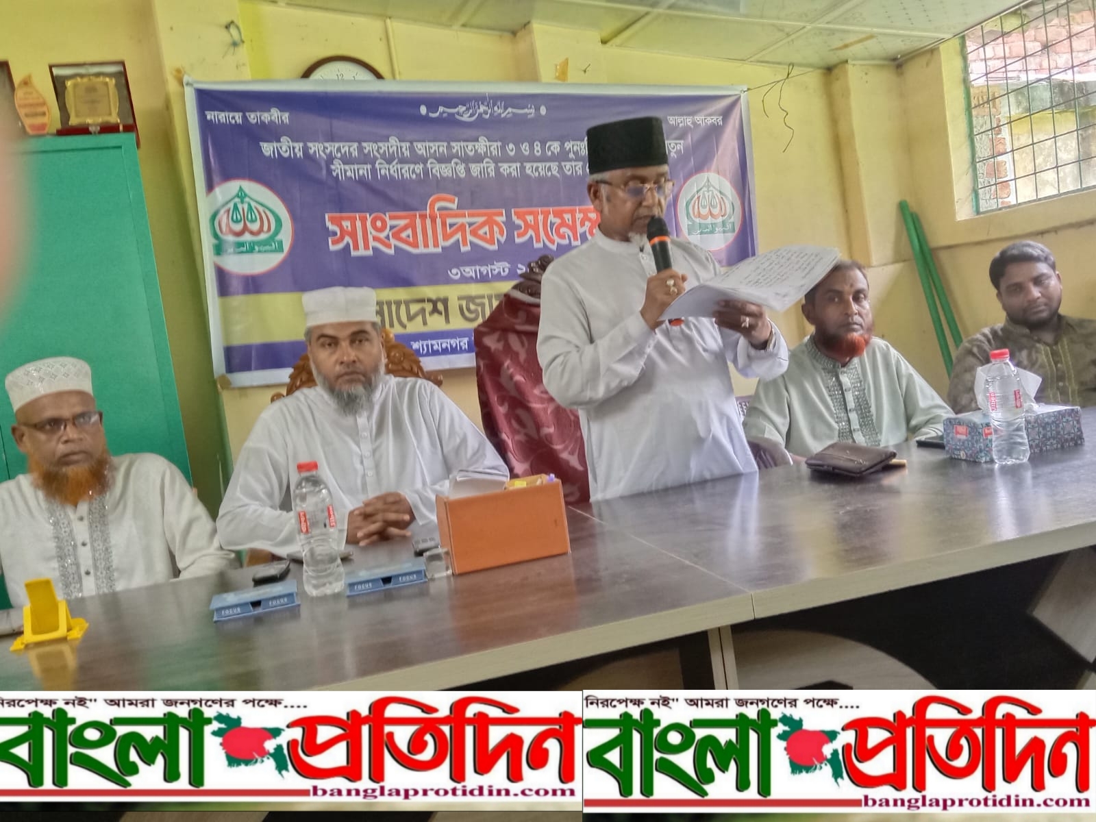 সম্মেলন অনুষ্ঠিত হয়। সংবাদ সম্মেলনে লিখিত বক্তব্যে সাবেক সংসদ সদস্য জামায়াত নেতা গাজী নজরুল ইসলাম বলেন, সাতক্ষীরা ৪ আসন পুনর্বিন্যাসের নামে সরকারী বিধি যথাযথ অনুসরণ করা হয় নি। দেশের সর্ববৃহৎ উপজেলা শ্যামনগর ও আশাশুনিকে একত্রিত করে সাতক্ষীরা -৪ আসনে পরিণত করায় উভয় উপজেলার মানুষের দুর্ভোগের চক্রান্ত করা হয়েছে। এই দুই উপজেলা বহু ব-দ্বীপ ও দুর্যোগপ্রবণ অঞ্চল নিয়ে গঠিত। উপজেলা ২ ভৌগোলিকভাবে বিচ্ছিন্ন ও দুর্যোগ পীড়িত উপজেলাকে এক আসনে অন্তর্ভুক্ত করা অযৌক্তিক ও জনবিরোধী সিদ্ধান্ত। পূর্বের ন্যায় শ্যামনগরকে একটি একক আসন অথবা শ্যামনগর ও কালিগঞ্জকে একত্র করে আলাদা একটি আসন গঠন করা হলে জনগণের উপকারে আসবে। সাতক্ষীরা জেলা সদরে যাতায়াতের প্রধান মাধ্যমে শ্যামনগরের বা আশাশুনির লোক জন একে অপরের উপজেলায় যেতে হয় না। বরং কালিগঞ্জ উপজেলার প্রধান সড়ক দিয়ে যেতে হয়। ইতিপূর্বে শ্যামনগরের পৃথক আসন ছিল এবং পরবর্তীতে শ্যামনগরের ১২ টি ইউনিয়ন কালিগঞ্জের ৮টি ইউনিয়ন নিয়ে সাতক্ষীরা ৪ আসন গঠিত হয়। সাতক্ষীরা-৪ আসনের সীমানা পুনর্বিন্যাস করে নির্বাচন কমিশনের খসড়া গেজেটটি সংশোধন করে জনগণের স্বার্থে আশাশুনির সাথে শ্যামনগর উপজেলাকে কোন অবস্থাতে সংযুক্ত না করার দাবী জানানো হয়।সংবাদ সম্মেলনে অন্যান্যদের মধ্যে উপস্থিত ছিলেন- উপজেলা জামায়াতের আমীর মাওলানা আবদুর রহমান, সেক্রেটারি মাওলানা গোলাম মোস্তফা, সহকারী সেক্রেটারি মাস্টার রেজাউল ইসলাম, সমাজকল্যাণ সম্পাদক শহিদুল ইসলাম ও জামায়াতের উপজেলা যুববিভাগের সভাপতি সাইদী হাসান বুলবুল প্রমূখ।