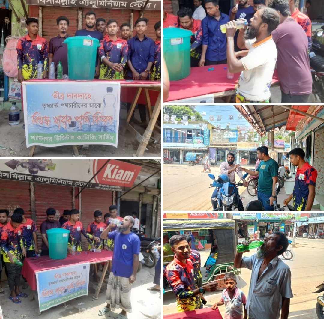 তীব্র তাপদাহে মহান মে দিবসে তৃষ্ণার্ত মানুষ, শ্রমজীবী ও সাধারণ পথচারীদের মাঝে বিশুদ্ধ পানি ও স্যালাইন বিতরণ করেছেন সেবা মুলক প্রতিষ্ঠান শ্যামনগর ডিজিটাল ক্যাটারিং সার্ভিস।