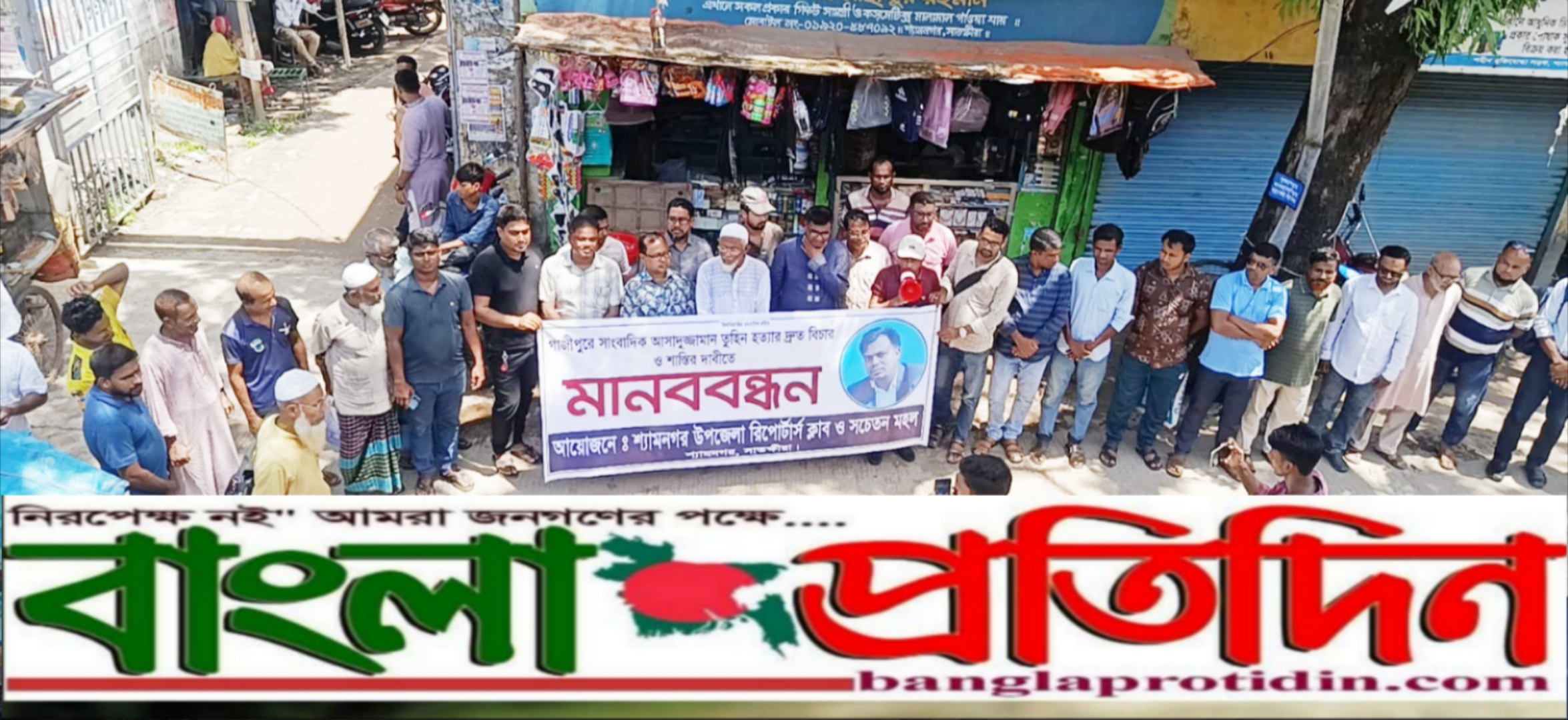 জাতীয় দৈনিক প্রতিদিনের কাগজ গাজীপুরের স্টাফ রিপোর্টার আসাদুজ্জামান তুহিন চাঁদাবাজদের বিরুদ্ধে ভিডিও ধারন করায় তাকে সন্ত্রাসীরা কুপিয়ে হত্যা করার প্রতিবাদ ও দ্রুত বিচারের দাবীতে সাতক্ষীরার শ্যামনগর উপজেলা রিপোর্টার্স ক্লাবের আয়োজনে মানববন্ধন ও প্রতিবাদ সমাবেশ অনুষ্ঠিত হয়েছে। রোববার ১০ আগস্ট সকাল ১১ টায় শ্যামনগর শহীদ মুক্তিযোদ্ধা সড়কের বিসমিল্লাহ মার্কেটেরে সামনে এ অনুষ্ঠান অনুষ্ঠিত হয়।