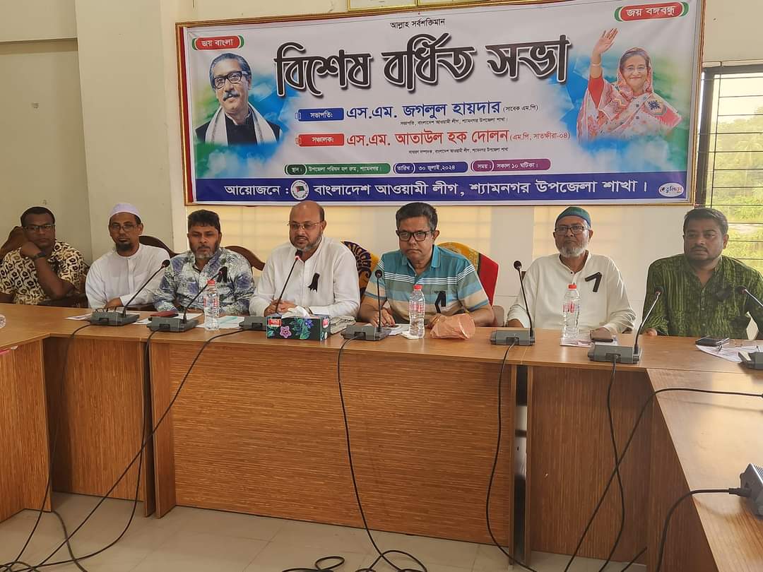 সাতক্ষীরা'র শ্যামনগরে জাতীয় শোক দিবস পালন উপলক্ষে উপজেলা আওয়ামী লীগের আয়োজনে বিশেষ বর্ধিত সভা অনুষ্ঠিত হয়েছে। ৩০ জুন মঙ্গলবার সকাল ১০ উপজেলা পরিষদ হল রুমে আলোচনা সভায় উপজেলা আওয়ামী লীগের সভাপতি এস এম. জগলুল হায়দার (সাবেক এমপি) সভাপতিত্বে। উপজেলা আওয়ামী লীগের সাধারণ সম্পাদক পরিবেশ বন ও জলবায়ু পরিবর্তন মন্ত্রণালয় সম্পর্কিত সংসদীয় স্থায়ী কমিটির সদস্য এস.এম. আতাউল হক দোলন (এমপি, সাতক্ষীরা-০৪) এর পরিচালনায়। বক্তব্য রাখেন উপজেলা আওয়ামী লীগের সহ-সভাপতি সহ-সভাপতি চেয়ারম্যান অধ্যক্ষ জাফুরুল আলম বাবু, আলহাজ্ব এস এম আফজালুর রহমান, গাজী আনিছুর জামান আনিস, অধ্যক্ষ জুলফিকার আল-মেহেদী লিটন, যুগ্ম-সাধারণ সম্পাদক স ম আব্দুর সাত্তার, প্রভাসক মোশাররফ হোসেন, সাংগঠনিক সম্পাদক গাজী গোলাম মোস্তফা, সুশান্ত বিশ্বাস বাবুলাল, উপজেলা আওয়ামী লীগের প্রাচার ও প্রকাশনা সম্পাদক উপজেলা পরিষদ চেয়ারম্যান সাঈদ উজ্জ- জামান সাঈদ, আইন বিষয়ক সম্পাদক মহিলা ভাইস চেয়ারম্যান খালেদা আয়ুব ডলি, শ্রম বিষয়ক সম্পাদক কুমুদ রঞ্জন গায়েন প্রমুখ। এসময়, বিভিন্ন ইউনিয়ন আওয়ামী লীগের সভাপতি ও সাধারণ সম্পাদক, বাংলাদেশ আওয়ামী যুব লীগ, আওয়ামী স্বেচ্ছাসেবক লীগ, বাংলাদেশ আওয়ামী মৎস্য জীবী লীগ, বাংলাদেশ কৃষক লীগ মহিলা আওয়ামী লীগ সহ বিভিন্ন সহযোগি সংগঠনের সভাপতি / সাধারণ সম্পাদক ও আহবায়ক যুগ্ম আহবায়ক দ্বয় উপস্থিত ছিলেন। বিশেষ বর্ধিত সভা সারাদেশে চলমান কোটা সংস্কার কে কেন্দ্র করে আওয়ামী লীগের ও সহযোগী সংগঠনের নেতৃবৃন্দ উপরে হামলায় নিহত দের আত্মার শান্তি কামনায় ও আহতদের সুস্থতা কামনা দোয়া করেন। দোয়া পরিচালনা করেন উপজেলা কোট মসজিদের পেস ইমাম মুফতি আব্দুল খালেক।